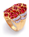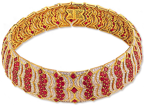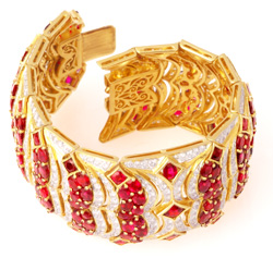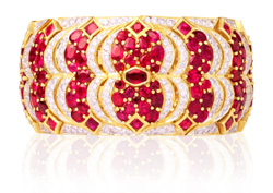 Được cẩn thật nhiều kim cương và hồng ngọc, ánh sáng rực rỡ của bộ nữ trang Hoàng Gia Chân Chính khiến bao cặp mắt đầy ngưỡng mộ, chiếu lấp lánh trên trái tim của những người yêu chuộng vẻ đẹp và trên đường đi tìm Chân Lý..