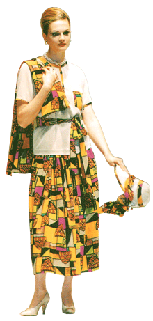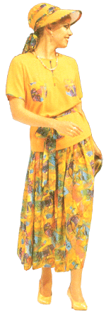 Fun in the sun wearing these bright silk prints. The design features short sleeves and a mid-calf length skirt. The scarf and belt enhance the charm of this lovely summer outfit. Blouse colors are tan, burnt orange, bright yellow, hot pink, light pink and puple.