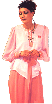 高雅的藍與純潔大方的白所搭配互補,特殊荷葉手袖與褲角獨特的裁剪設計,充分展現出女性嬌羞可愛的風姿,寬鬆的水洗絲上衣與厚緞的長褲可使女性在外出時展現輕鬆活潑的一面,加上中國古典腰飾的搭配,令人在悠遊自在中不失典雅的氣質。
