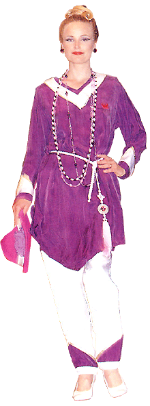 互補、對稱、協調是此款天衣的特色,上衣下襬的三角型剪裁適合重理性思維、個性獨立的女性。水洗絲上衣,厚緞長褲,藍紫搭配白色。