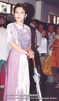 The ornamental velvet flowers on the waist and the front of the blouse compete with each other at a distance.