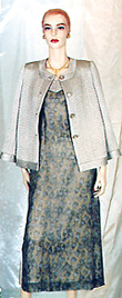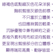 The long jacket features the same quilted fabric that enhances the 3-D visual effect. The outfit reflects elegantly and lively.
