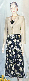 The long rounded collar and the two half-moon shaped pockets on both sides of the waist-high jacket symbolize harmony. The decorative flowers on the front, made of the same fabric, transform the look of the outfit when the jacket is buttoned up.