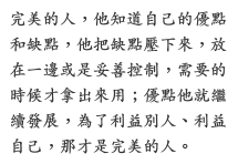 「我們來這個世界,是為了學習完美,所以什麼品質都需要擁有,而且要知道如何中庸的運用。」