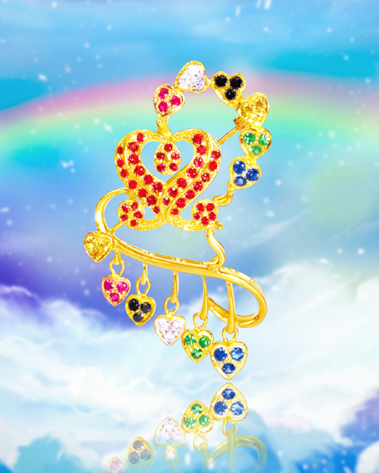 「寰宇家族」(Global Family)胸針中央是典雅的S.M.標誌,周圍環繞著不同顏色寶石鑲成的愛心,分別象徵各色人種、大自然和動植物,所有的眾生都是寰宇大家族的成員,大家心心相連,凝聚成一個靈性共同體,無分你我,一起在上帝的榮光中成長茁壯。